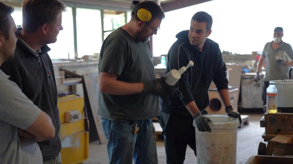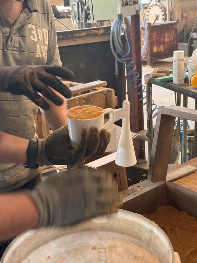 Im nächsten Versuch verwendeten die Experten von Niedersachsen ADDITIV das Material „PLA Aero“. Der Kunststoff verfügt über ein Schaummittel als Zusatz. Durch die Düsentemperatur des 3D-Druckers schäumt das Material auf und spart etwa die Hälfte der Masse ein. Zusätzlich verlegte das Team den Anguss vom Henkel auf den Tassenboden. So konnte der Angussquerschnitt vergrößert und die verlorene Form schneller verdampfen.