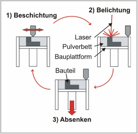 Mit dem LPBF–Verfahren lassen sich Bauteile mit komplexen Geometrien, wie z.B. Hohlräume und Hinterschneidungen, ganz ohne Werkzeuge herstellen. Hierbei wird das Bauteil auf einer Platte Schicht für Schicht aus Pulver aufgebaut, indem dieses lokal aufgeschmolzen wird. Ein Hochleistungslaserstrahl fährt dabei die zur aktuellen Schicht gehörenden Konturen und Flächen des Bauteils ab. An den bestrahlten Stellen schmilzt das Pulver. Anschließend wird die Bauplatte abgesenkt und eine neue Pulverschicht aufgebracht. Diese Schritte werden so oft wiederholt, bis das Bauteil fertiggestellt ist.